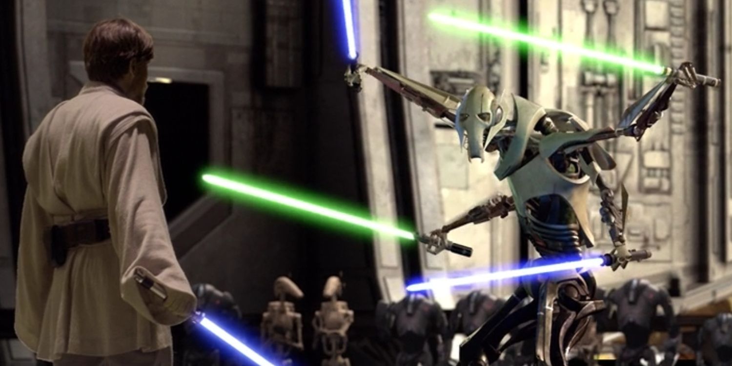 El primer duelo de Obi-Wan en la trilogía precuela fue contra un oponente con un sable láser de doble hoja, que sólo podía ser superado por un villano que empuñaba cuatro armas a la vez. Antes de que el general Grievous encendiera un solo sable de luz, Obi-Wan demostró rapidez de pensamiento al aplastar a la mayoría de los MagnaGuardias, decapitando casualmente al último. La capacidad de Obi-Wan para desarmar rápidamente a un enemigo que mató a tantos Jedi mostró su crecimiento como espadachín y, posteriormente, hizo que su próximo oponente fuera aún más fuerte en comparación.