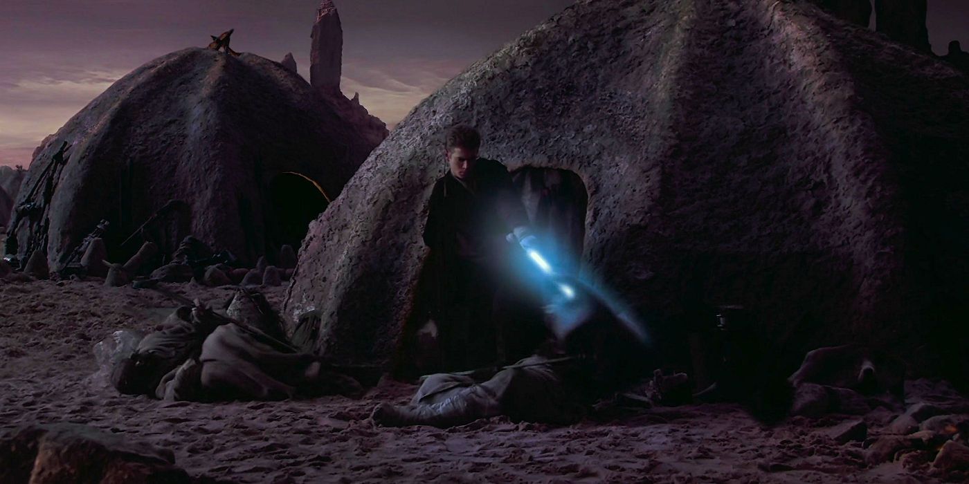 “/> Quizás en una de las escenas más cargadas de emociones de todo El ataque de los clones, Anakin regresa a Tatooine solo para descubrir que su madre ha desaparecido, lo que hace que las cosas empeoren rápidamente. Cuando descubre que los Tusken se han llevado a su madre, Shmi, se propone encontrarla. Anakin regresa con su cuerpo, llorando y diciendo Él masacró a todas las personas en el campamento por lo que le hicieron.. Es una escena horriblemente trágica y realmente muestra hasta qué punto Anakin se está alejando del lado luminoso de la Fuerza.