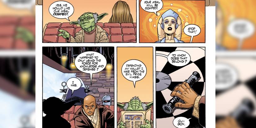 Otra historia no canónica (incluso antes de que Legends fuera un concepto) de Dark Horse. Cuentos de Star Wars #7 presentó una historia corta llamada “Ficción de fuerza”un homenaje humorístico al papel de Samuel L. Jackson en Ficción popularEn él, Yoda y Mace Windu están en un restaurante almorzando poco después de los eventos de La amenaza fantasma. Sentado hilarantemente en un asiento elevador, Yoda usa un truco mental Jedi con la camarera para conseguir su comida gratis, algo que Mace desaprueba por completo.