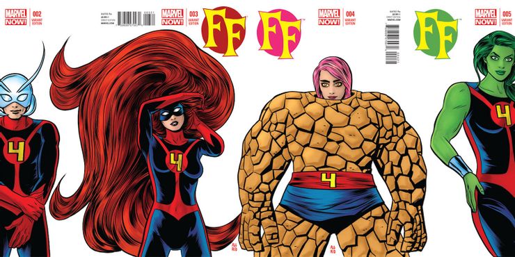 She-Hulk se unió a los Cuatro Fantásticos en uno de los mejores arcos de la historia del equipo en la década de 1980. Se unió a una nueva versión del equipo, simplemente renderizada como FF, en FF # 1 en 2013. El tema es clave en muchos aspectos, incluido ser una nueva era tanto para Jennifer como para los Cuatro Fantásticos que se centra en el nuevo concepto de Future Foundation.