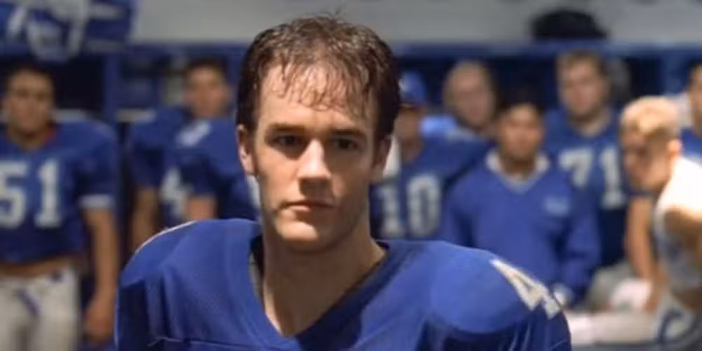Azul universitario fue lanzado en el apogeo del estatus de ídolo adolescente de James Van Der Beek. El galán fue elegido como el mariscal de campo suplente Jonathan”Mox” Moxon en la ciudad ficticia de West Canaan, en Texas, obsesionada con el fútbol. Dirigida por Brian Robbins, la película exploró las presiones ejercidas sobre los atletas jóvenes y la mentalidad tóxica de ganar a toda costa encarnada por el autoritario entrenador Kilmer de Jon Voight.