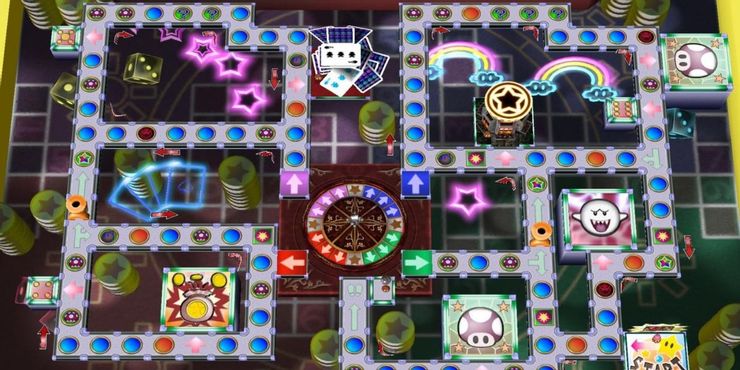 Un tablero inspirado en un casino con luces brillantes y una rueda de ruleta seguramente hará que sea memorable fiesta mario juegos secundarios y diversión. Los goombas manejan todas las tiendas y juegos, y los jugadores deben vigilar sus fondos para asegurarse de no perder demasiado durante un giro en la ruleta. Incluso hay juegos de cartas de Goomba que se pueden jugar para ganar artículos.