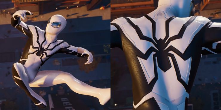 Los lentes de los ojos bulbosos son diferentes a cualquier otro en el juego y la textura del traje está sutilmente hecha pero tiene un patrón que hace que el traje se vea futurista. Incluso las partes blancas están diseñadas para parecer una armadura brillante. Es un ejemplo de Insomniac tomando un traje icónico de los cómics y dándole su propio toque.