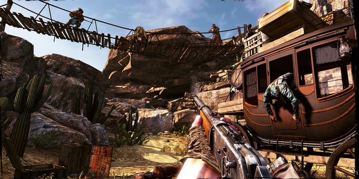 Aunque se inclina fuertemente hacia el género de ciencia ficción como todos los demás juegos de Fallout, Fallout New Vegas es lo que más se acerca a un western. Desde la música atmosférica hasta las ciudades que se sienten sacadas directamente de un western de la vieja escuela, como Los siete magníficos. Incluso las armas coinciden con muchos tropos occidentales, pero se actualizan con un toque de ciencia ficción.