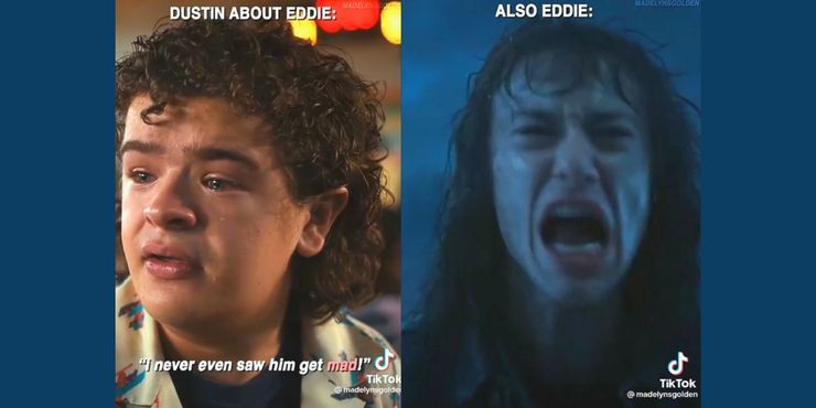Usuario de TikTok @madelynsgolden hizo una compilación de todas las veces que Eddie se enojó juguetonamente en respuesta a que Dustin le dijo al tío de Eddie lo gran hombre que era y que nunca lo había visto enojarse. Si bien esa no fue necesariamente una declaración cierta, los fanáticos apreciaron mucho el sentimiento sincero y la conversación significativa entre Dustin y el Sr. Munson.
