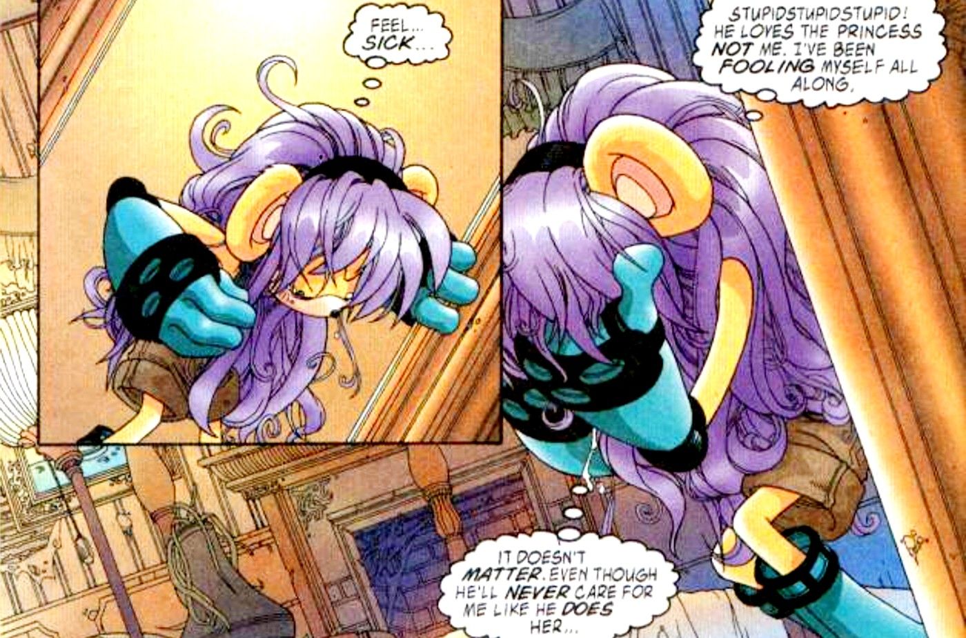 Mina Mongoose fue una adición muy bienvenida a Archie’s Sonic canon, convirtiendo el romance favorito de Sonic y Sally en un triángulo amoroso. Aunque los lectores apoyaron principalmente a Sally durante este tiempo, Mina y Sonic se conectaron en muchos niveles, principalmente debido a su velocidad compartida y la pérdida de sus familias por el proceso de robotización. Mina luchó junto a Sonic en los Freedom Fighters, pero le rompieron el corazón. Sonic el erizo #123, de Karl Bollers, Ken Penders, Jeff Axer, Art Mawhinney y Nelson Ribeiro. Mina escuchó a Sonic confesarle su amor a Sally, y su reacción demostró el realismo emocional que tan a menudo realzaba el drama más grande que la vida de la serie.