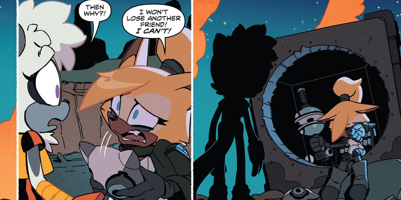 Todo sobre Whisper the Wolf es trágico. Su pasado es tan desgarrador que le robó la voz. Uno de sus compañeros de equipo traicionó y asesinó al resto de su equipo, y Whisper siente que ella es la responsable. Pero lo que realmente toca la fibra sensible de los lectores no es el flashback real en Ian Flynn y Evan Stanley. Sonic the Hedgehog: Enredo y susurro #4 – es cuán enfáticamente Whisper reacciona ante su nuevo amigo Tangle the Lemur cuando Tangle le pregunta por qué no puede continuar con su misión juntos. El comportamiento taciturno de Whisper se quiebra y admite que no puede perder a nadie más. La mirada de desesperación en su rostro es simplemente brutal, y está claro que si bien la fuente de su trauma puede estar en el pasado, aún tiene que escapar de su influencia.