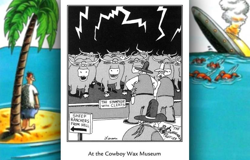 A Larson le encanta visitar el Viejo Oeste en El lado lejanoañadiendo nuevos y ridículos giros y vueltas a la peligrosa e ingrata vida de los vaqueros. En esta tira, un grupo de vaqueros visita un museo de cera con temática de terror y se encuentra con exhibiciones horribles (pero imposibles) como una estampida en la que las vacas llevan zapatos con clavos, un ladrón de ganado cuya inmortalidad significa que nunca podrá ser detenido y algunos ganaderos de ovejas inexplicablemente horrorosos.