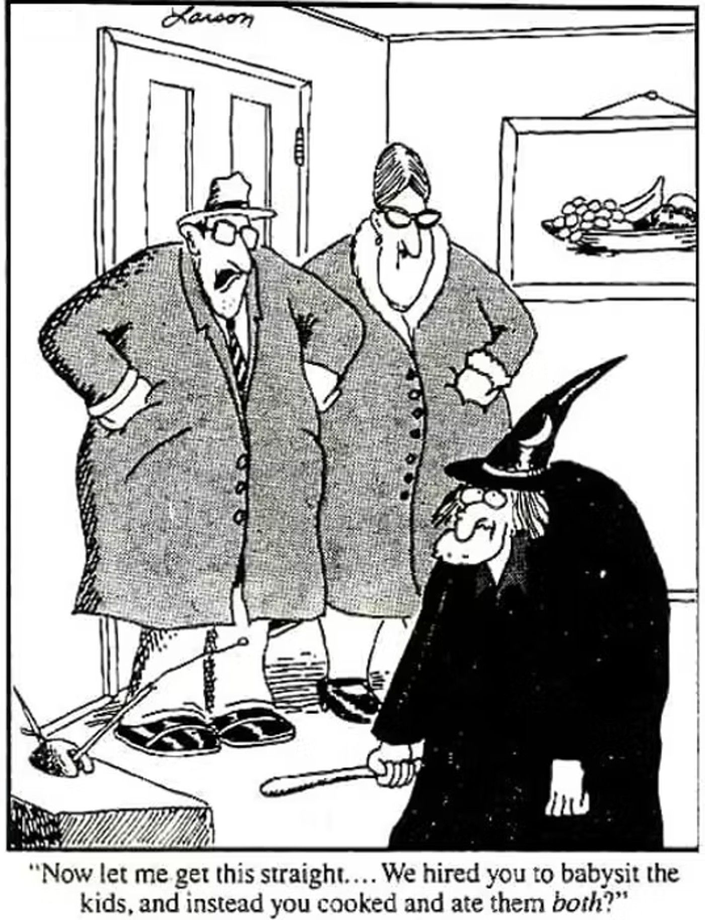 “/> Mientras El otro lado se ve como una comida familiar, tiene una racha morbosa de una milla de ancho y juega con la idea de que los niños y/o los animales sufran daño con sorprendente frecuencia. Estas son las tiras que generaron más controversia, y Larson admite que puede entender el odio resultante de algunos de sus trabajos más oscuros. Sin embargo, en La prehistoria del otro lado él nombra esta tira “Uno de mis favoritos,” explicando que es tan evidentemente ridículo que no ve cómo alguien podría ofenderse genuinamente. Larson también destaca el detalle que hace que aún hoy le guste el humor de esta tira: “Están especialmente molestos porque la bruja se comió a sus dos hijos, como si sugerir que uno hubiera sido bastante malo, pero ambos es realmente inaceptable”.