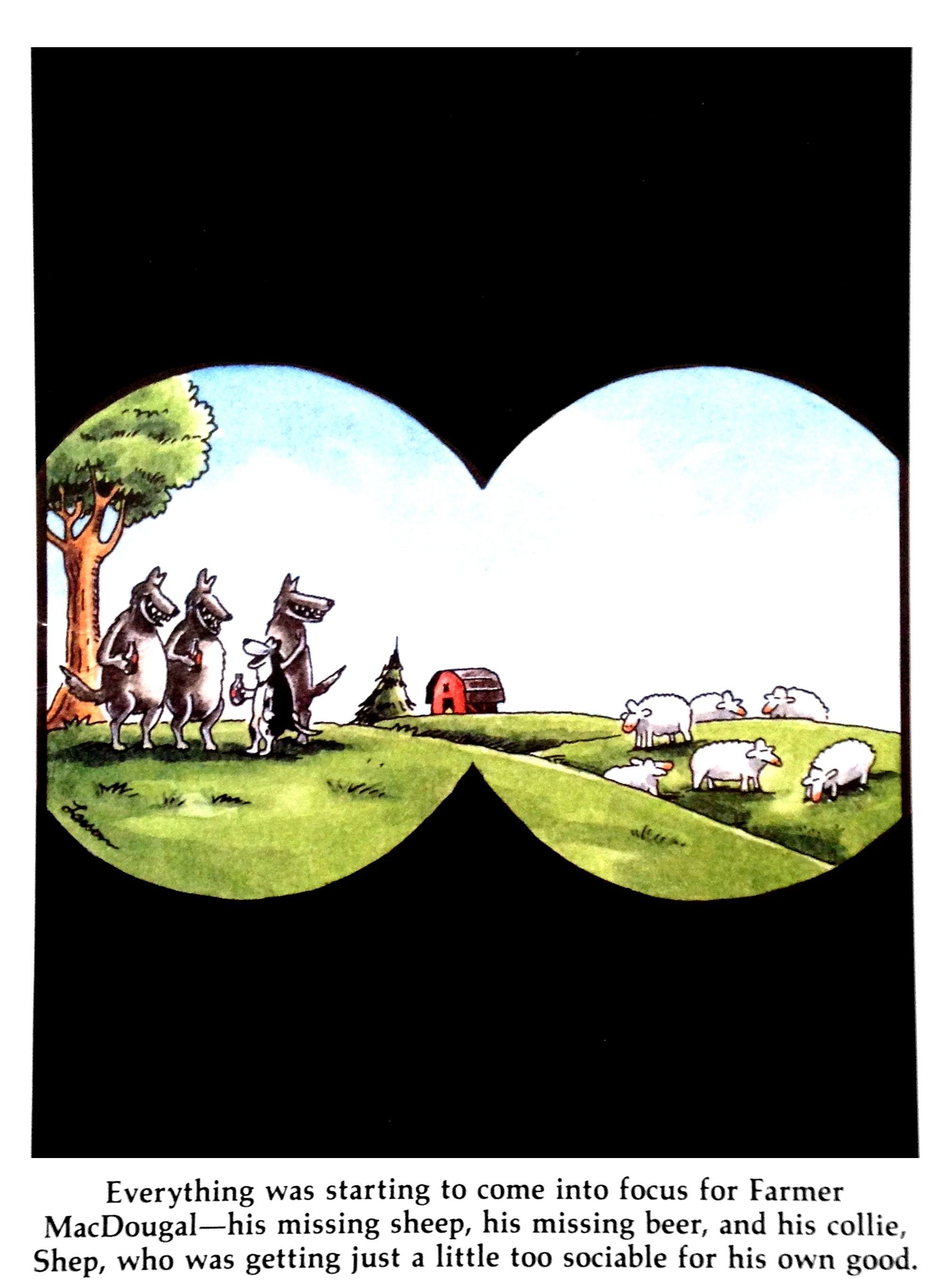 “/> Una vez más, Larson cuenta una historia que comienza en la página y termina en la cabeza del lector; sin embargo, el detalle definitorio aquí es establecer la historia dentro de los límites de los binoculares del granjero MacDougal. Un caricaturista menos talentoso podría contar el mismo chiste con una imagen similar de Shep charlando con los lobos, pero al presenciar este momento a través de los ojos de un personaje invisible, de repente la “historia” adquiere una capa de caracterización completamente nueva, y el personaje real La imagen se convierte en un momento integral en la realización de MacDougal. Normalmente se utiliza un solo panel, El otro lado es una clase magistral sobre el uso de diferentes elementos para ampliar la información que se ofrece – Larson carga el primer plano y el fondo con contexto adicional siempre que sea posible o, en este caso, incluso hace que la perspectiva forme parte del chiste.