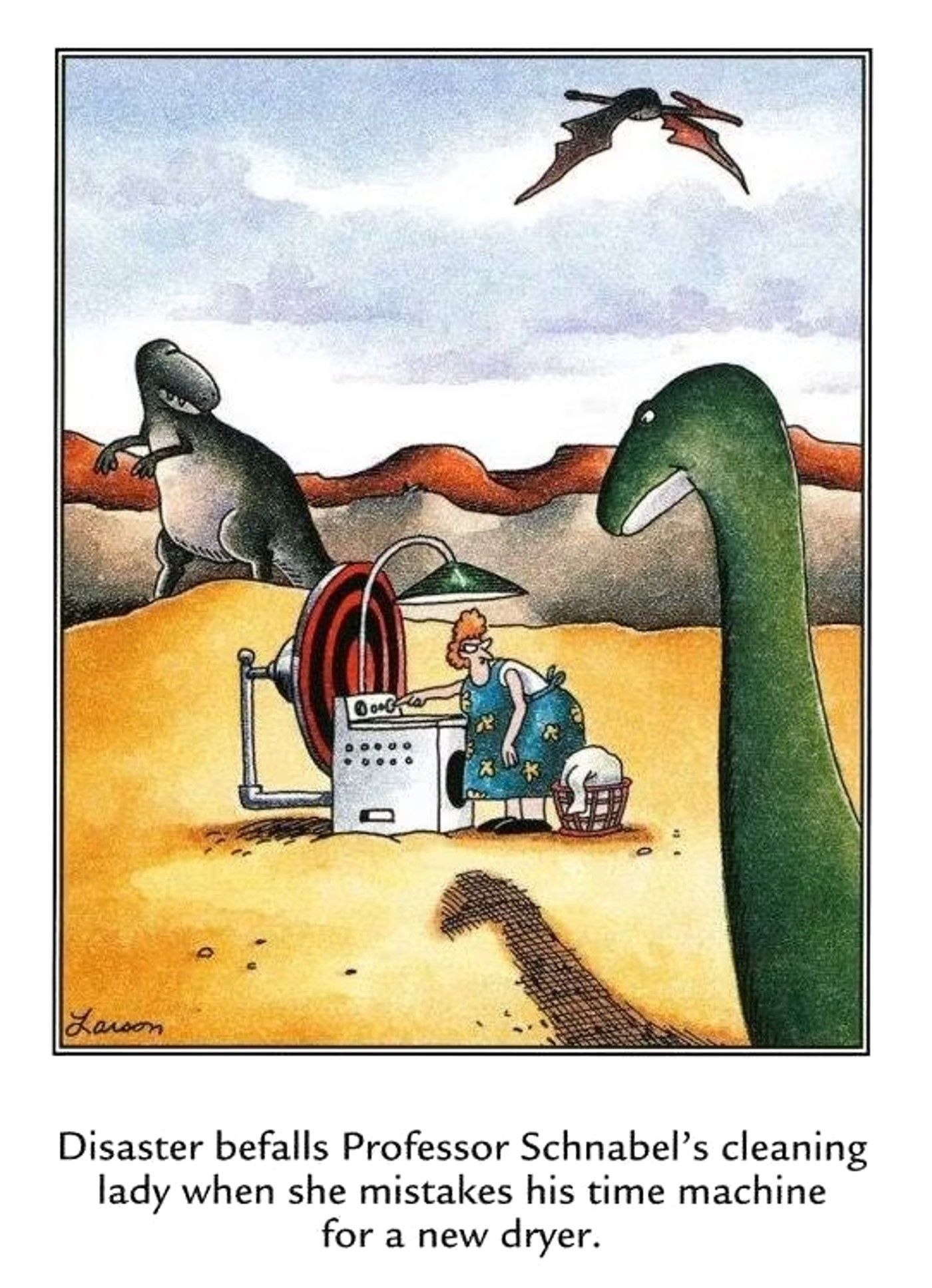 “/> Uno de El otro ladoEn uno de los cómics más famosos, las desventuras de la señora de la limpieza del profesor Schnabel utilizan varios larsonismos, desde el nombre del profesor invisible hasta la inclusión de los dinosaurios como depredadores naturales de los humanos, pasando por la presencia de su característica mujer de pelo de colmena. El cómic también muestra el perfecto sentido del encuadre de Larson. – un T-Rex desconcertado, un diplodocus enojado y un pteradón desinteresado dejan claro que la estrella humana está totalmente rodeada. El cómic también incorpora El otro ladoEl lado oscuro, dejando en claro que este comic solo puede terminar en una muerte espantosa.