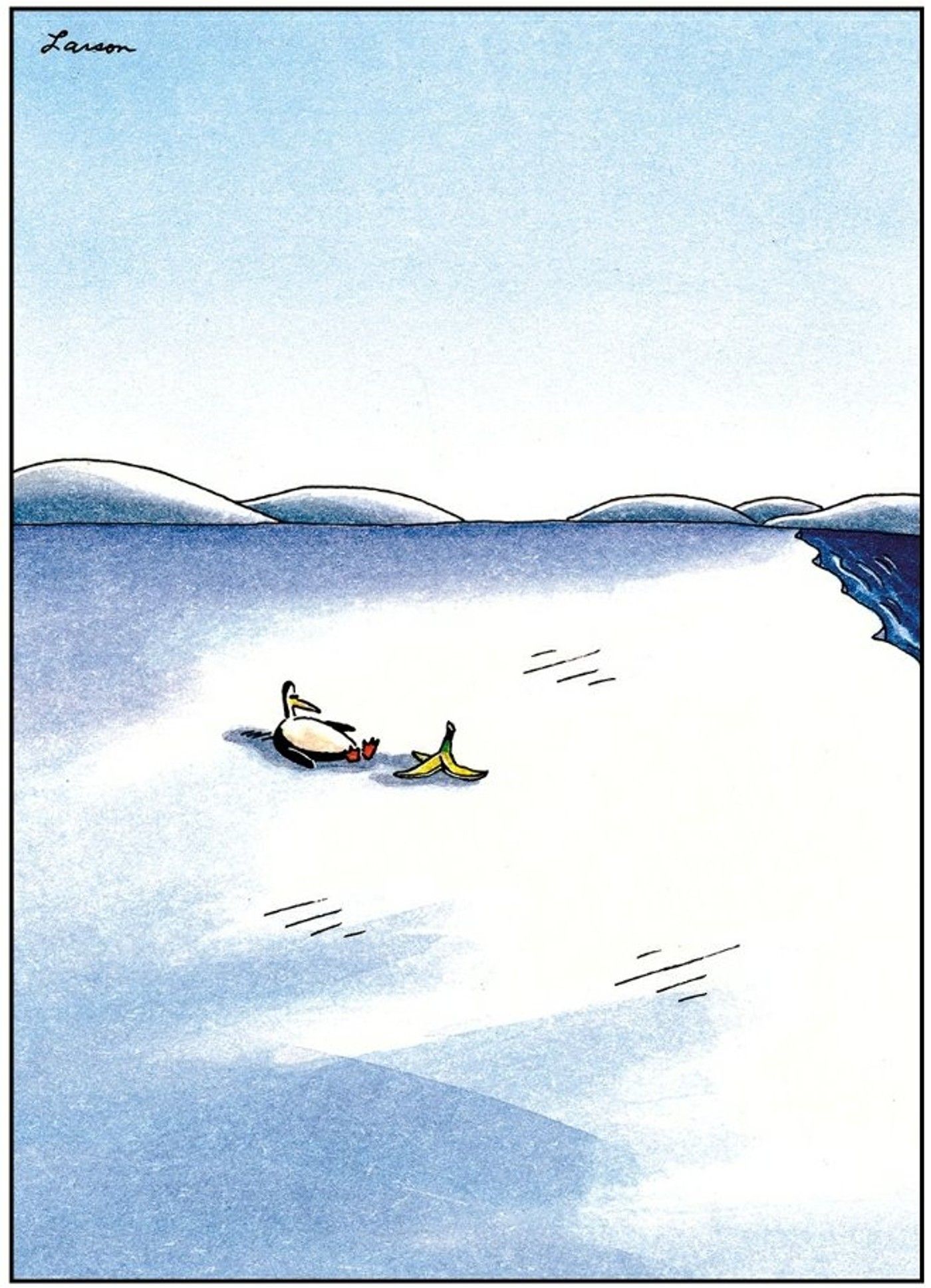 “/> Quizás el perfecto Lado lejano cómic, esta tira es una broma obvia e inmediata que solo se vuelve más satisfactoria con el tiempo. Basándose en una risa clásica, el cómic también se divierte con la idea visual de un pingüino al que de alguna manera le falta la piel de un plátano colocado sobre una vasta extensión de nieve. Larson encuadra el momento a la perfección (la distancia lo hace sentir más ridículo) y aprovecha al máximo su estilo artístico minimalista, mientras el ceño vagamente fruncido del pingüino invita al lector a imaginar su reacción.