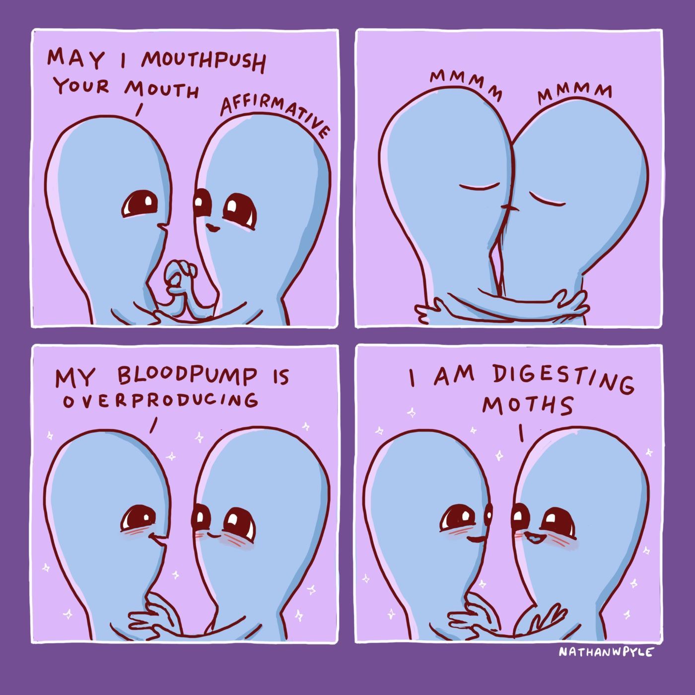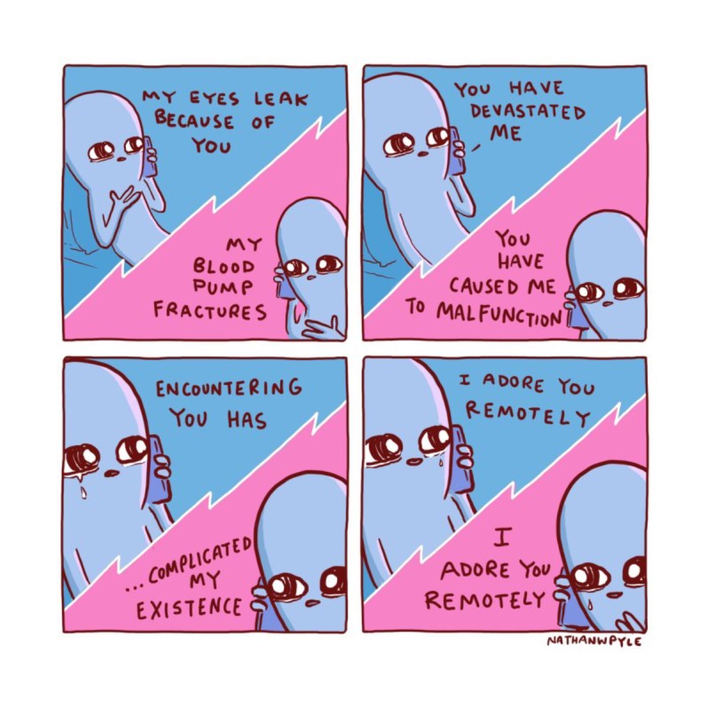 Rompiendo con el formato de cuatro paneles, esta tira en particular logra asegurarse un lugar como una de las adiciones más icónicas a la Planeta extraño serie con su sucinta parodia de las convenciones románticas humanas. Con un guiño a las peculiaridades del afecto humano, analiza con humor los gestos de amor que realizamos, ya sea intercambiando plantas marchitas o ilustrando el amor con imágenes de órganos vitales atacados por armas. La genialidad del cómic radica en su capacidad para subrayar el absurdo inherente de nuestras interacciones y rituales sociales, al tiempo que se basa únicamente en la verdad sin adornos y en diálogos redactados de forma creativa para aclarar el punto.