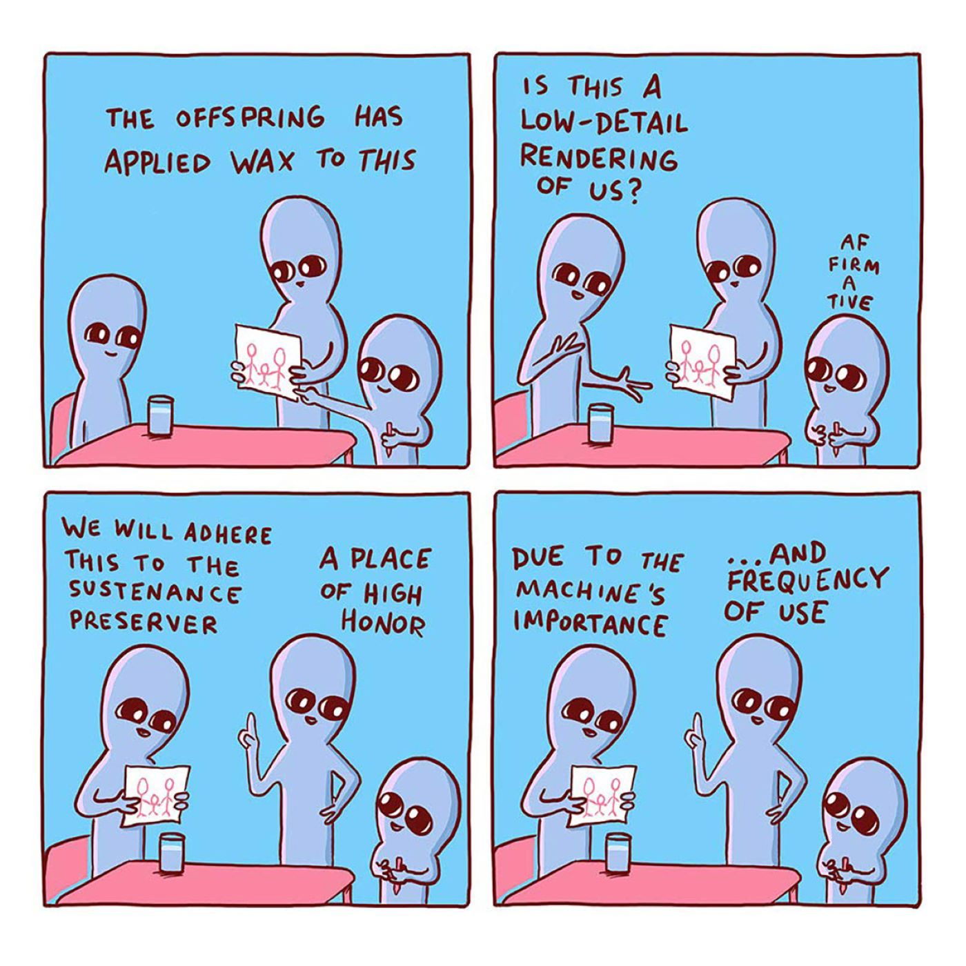 Al aventurarse en el intrincado mundo de la dinámica familiar, la interpretación de Nathan Pyle en “Low-Detail Rendering” brilla con brillantez. El gesto conmovedor de un niño que hace un dibujo para sus padres da un giro imaginativo en esta tira cómica, revelando un nivel de practicidad tan contundente que roza el insulto. Esto se hace evidente cuando los padres extraterrestres, con su franqueza característica, etiquetan inicialmente el dibujo como “Representación poco detallada de nosotros.” Sin embargo, lo cuelgan en el frigorífico, o “conservante de sustento“como muchos padres humanos. Por lo tanto, esta escena resume maravillosamente el rasgo definitorio de literalidad excesiva y sinceridad sincera que caracteriza El planeta extraño seres.