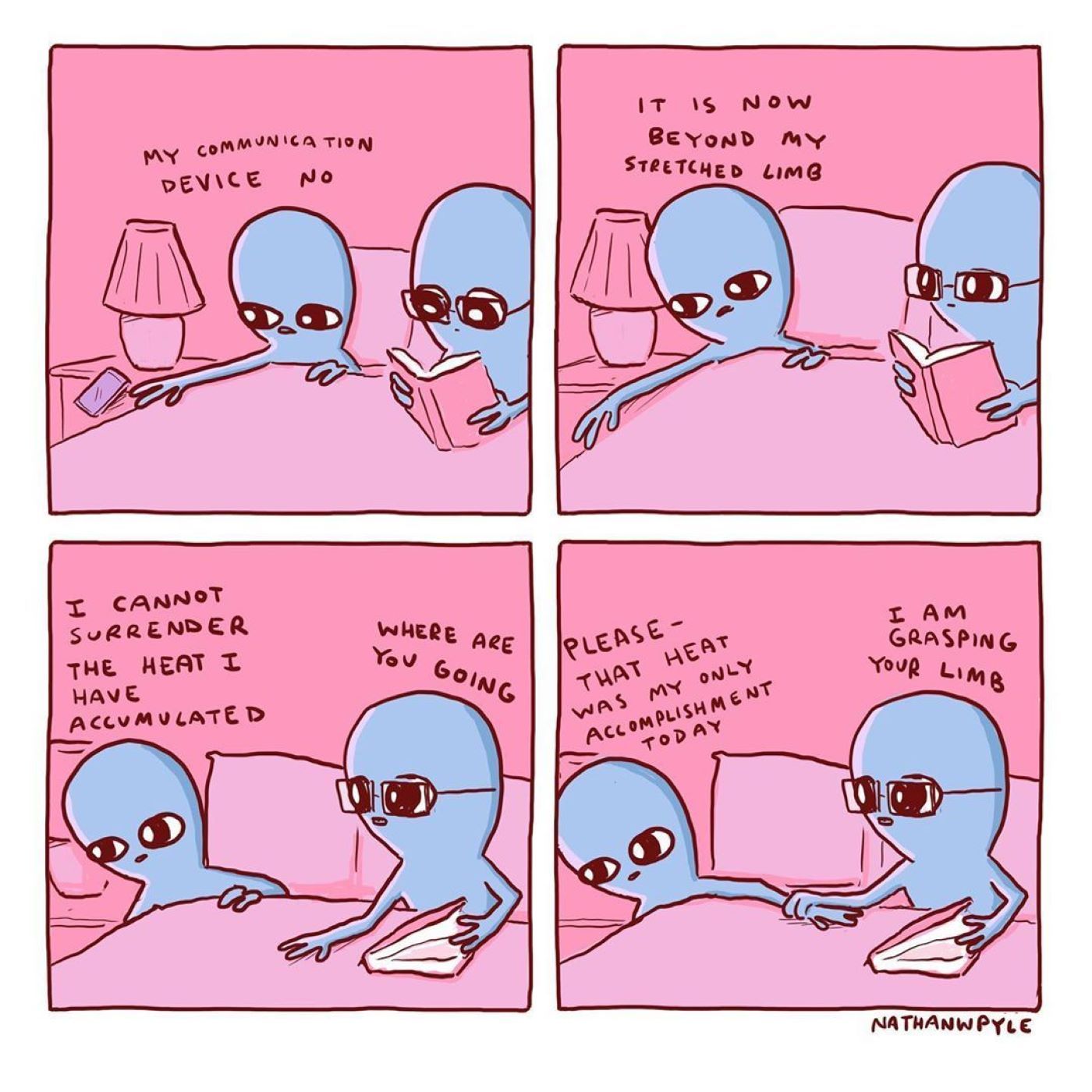 La representación de la lucha a la hora de dormir en “Communication Device”, que involucra el conocido percance de dejar caer el teléfono y la posterior prueba de recuperarlo, toca la fibra sensible de todos. Además, profundiza con humor en la condición humana desde El planeta extraño característico y curioso alejamiento, cuando el ser se lamenta de que su único logro del día fue calentar con éxito su lugar en la cama, un sentimiento que sin duda resuena en aquellos que han experimentado días como este, cuando la existencia se sentía como el pináculo del logro. La tira cómica ejemplifica la habilidad de la serie para descubrir el humor en lo cotidiano, un tema recurrente en Planeta extraño historietas.
