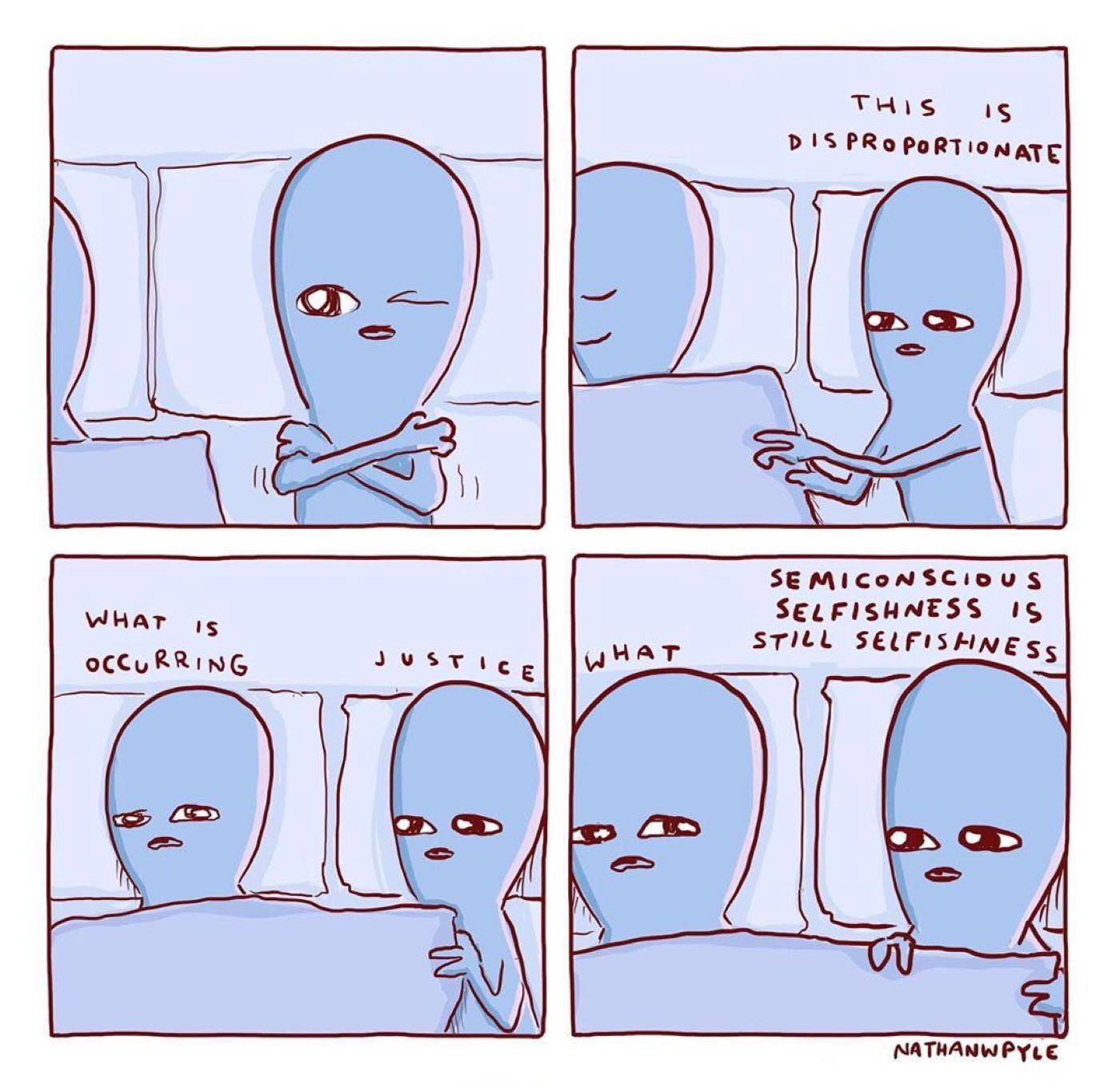 “Egoísmo semiconsciente” es una versión hilarante de la notoria naturaleza de compartir una manta con otra persona, que pone a prueba las relaciones. La mayoría de las personas han acaparado las mantas y un compañero cómodo se las ha arrancado. Es un verdadero testimonio de la creatividad de Nathan Pyle, como se muestra en Planeta extraño, así como su habilidad como creador de palabras, para poder elaborar descripciones completamente ridículas pero precisas de sucesos aparentemente insípidos en la existencia humana. La frase completa, “El egoísmo semiconsciente sigue siendo egoísmo.,” sin duda ha encontrado su camino en el vocabulario de los fanáticos, especialmente cuando reprenden en broma a sus seres queridos por sus errores garrafales al dormir.