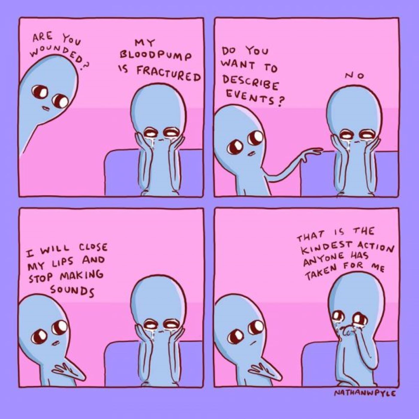 Lo que es particularmente brillante de “Fractured Bloodpump” es cómo utiliza el lenguaje reconfortante, a veces usado en exceso, de “No hablaré, pero me sentaré contigo en tu dolor,” y le infunde un giro completamente único y alegre, uno que solo podría provenir del mundo de Strange Planet. En una escena típicamente representada con remordimiento y tristeza, este cómic logra ser refrescantemente diferente. La frase “Cerraré los labios y dejaré de hacer sonidos.” también es una valiosa adición al conjunto de herramientas de apoyo emocional de cualquier persona, en el sentido de que es tan literal y tan inequívoco que no se puede derivar de él ningún significado erróneo o intención equivocada.