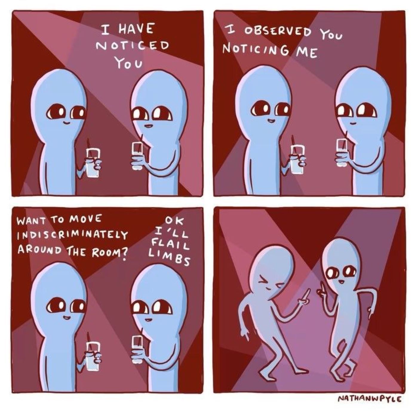 Sin lugar a dudas, las situaciones sociales incómodas acaparan la atención, como uno de los temas más explorados en Planeta extraño. Pocos escenarios pueden igualar la incomodidad social de decodificar el contacto visual compartido como indicador de interés, especialmente cuando ocurre antes de reunir el coraje para invitar a alguien a “miembros inestables” juntos en la pista de baile. Esta tira cómica resalta magistralmente lo absurdo de una interacción social humana común, donde se considera normal acercarse a un extraño y pedirle que “moverse indiscriminadamente por la habitación” como un medio para evaluar el interés mutuo como posible pareja romántica.