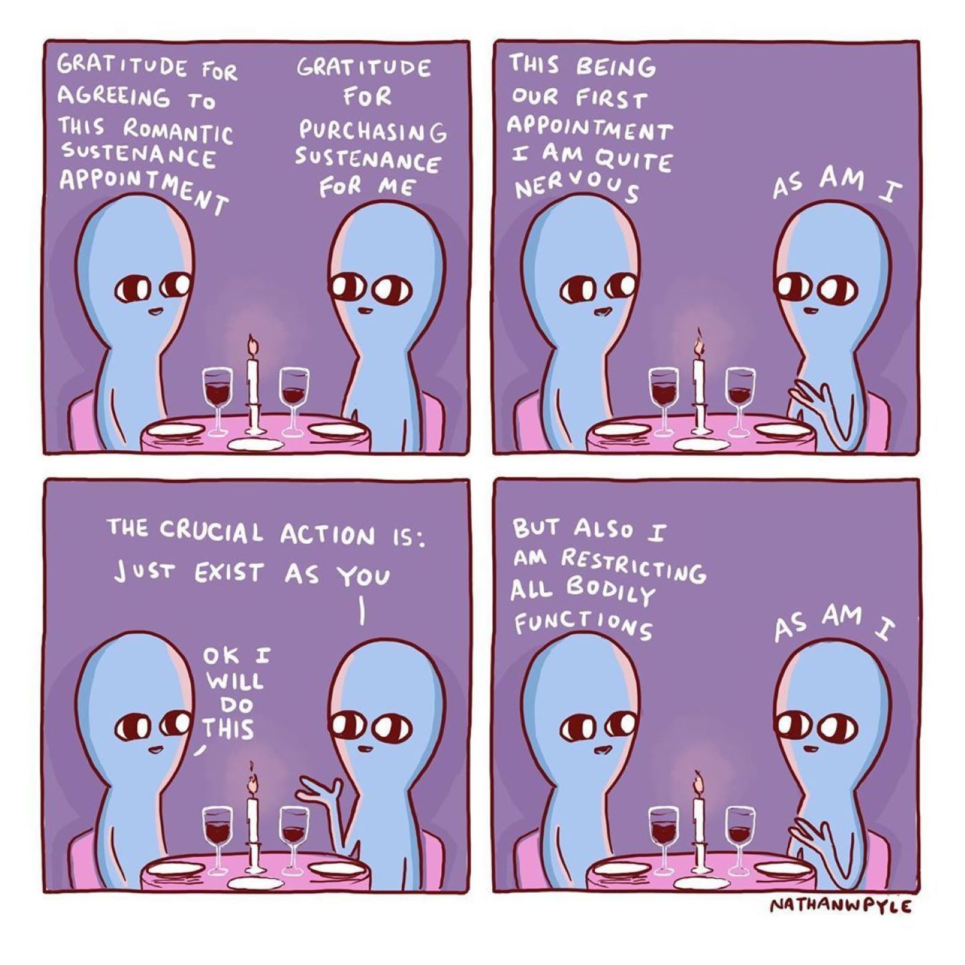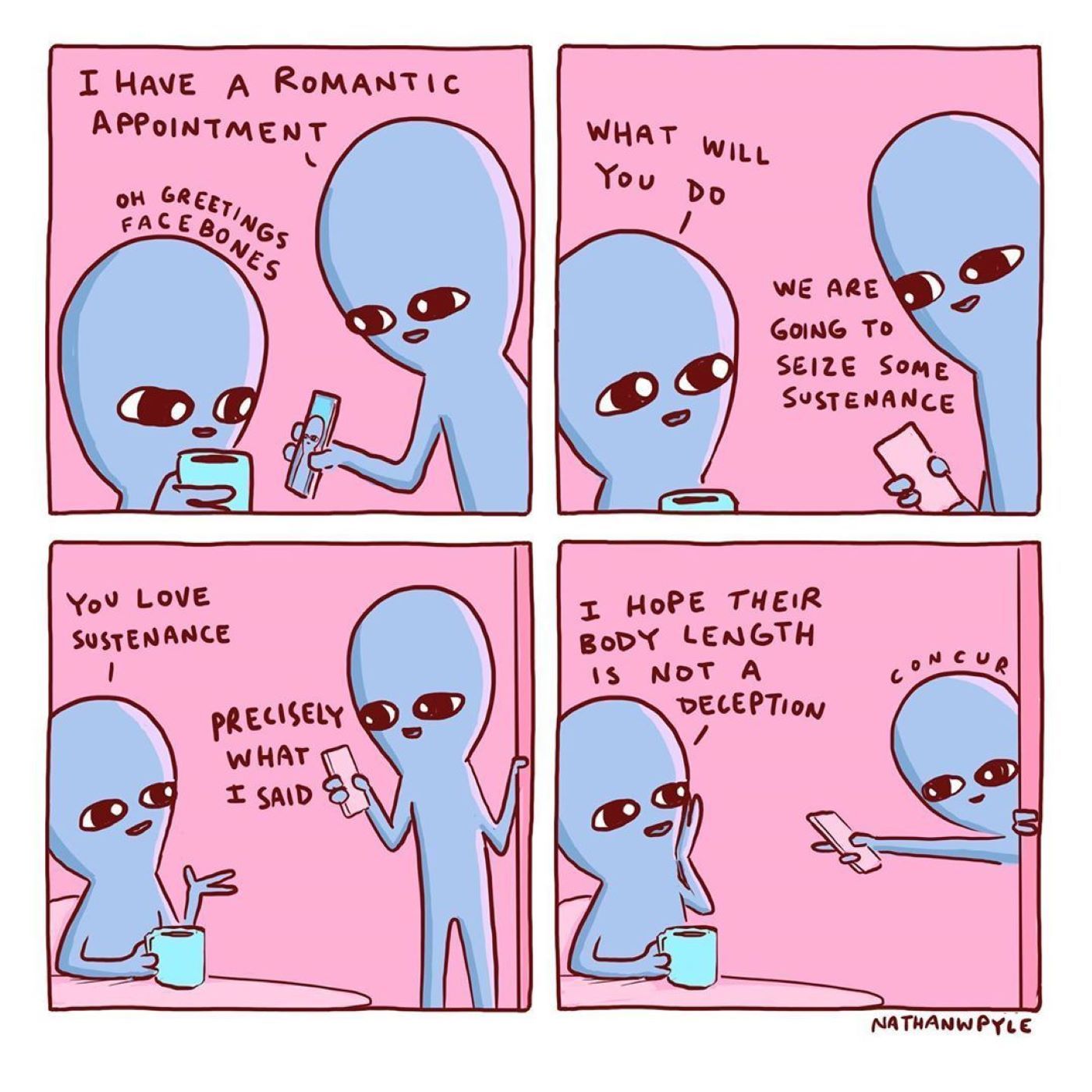 Las citas por Internet proporcionan mucho material para el humor, y Planeta extraño se apresura a aceptar la hilaridad del ámbito de las citas online. En “Romantic Appointment”, el cómic hace un comentario alegre sobre las típicas conversaciones previas a una cita entre amigos, incluido el momento en el que un amigo envía buenos deseos para un encuentro exitoso. Planeta extraño hace esto en su panel de cierre, dando el remate cuando el ser llama a su amigo, “Espero que la longitud de su cuerpo no sea un engaño.,” burlándose de la práctica predominante de exagerar la altura en las aplicaciones de citas, así como del hecho de que las fotografías a veces pueden traicionar la realidad de qué tan alta es realmente una persona.
