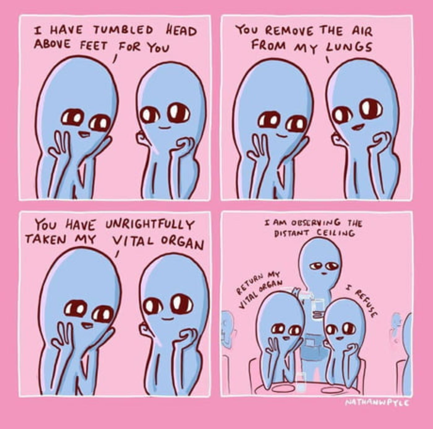 “Return My Vital Organ” se adhiere a un tema clásico, destacando la experiencia del amor que todo lo consume. Sin embargo, el fraseo distintivo de Nathan Pyle hace su magia en esta tira, transformando ingeniosamente lo ordinario “robaste mi corazón” tropo en una interpretación hilarantemente peculiar: “Has tomado injustamente mi órgano vital..” Este giro es emblemático de El planeta extraño talento incomparable para tomar lo ordinario e inyectarle una dosis de humor, haciendo de cada tira una exploración inolvidable y cómica de la experiencia humana. Sin embargo, lo que realmente lleva esta entrada al borde de la perfección es el camarero del fondo, que murmura: “Estoy observando el techo lejano“.