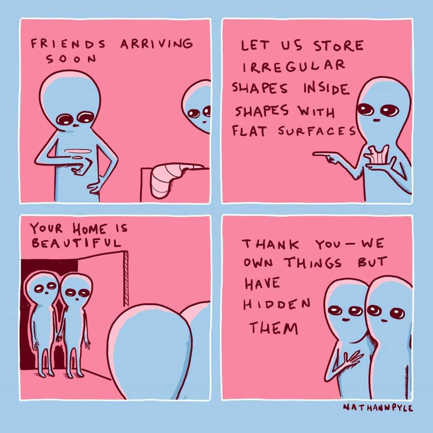 El planeta extraño El genio satírico proviene de su capacidad para burlar las desconcertantes costumbres sociales en las que los humanos a menudo participan. La práctica común de preparar la casa para recibir invitados mediante la limpieza, hasta el punto en que parece completamente desprovista de pertenencias personales, se deconstruye en “Irregular Shapes”, con Pyle resume este fenómeno en la frase inteligente y acertada: “almacene formas irregulares dentro de formas con superficies planas.“Es un testimonio de la habilidad del cómic para analizar con humor las rarezas cotidianas y, en este caso, ofrecer una interpretación ingeniosa y precisa de una peculiaridad humana demasiado familiar. Planeta extraño De hecho, se ha convertido en una preciada fuente de risas y comprensión de nuestros rituales sociales compartidos, aunque enigmáticos.