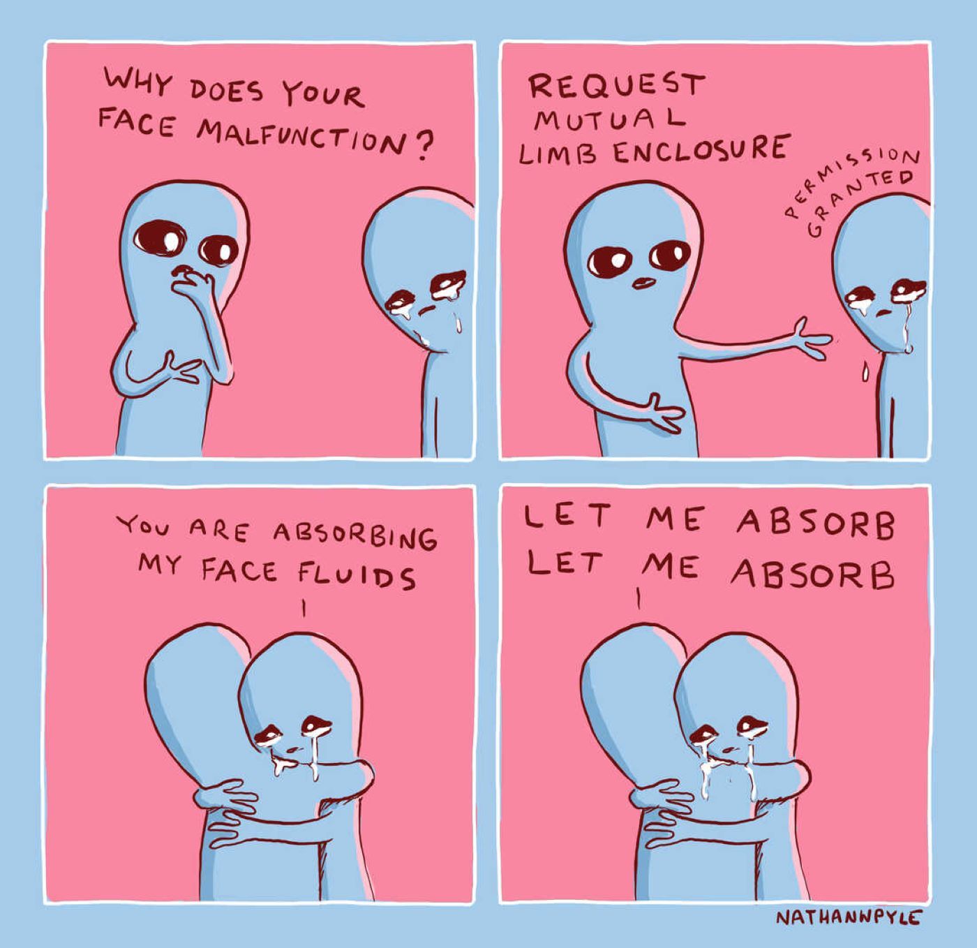 El “mal funcionamiento facial” es esencial Planeta extraño cómic, completo con su característico diseño de cuatro paneles, su relajante paleta de colores pastel y el léxico caprichoso que es el sello distintivo de la serie. El lenguaje inventivo de Nathan Pyle está a la vista, mientras transforma el llanto en un “mal funcionamiento de la cara,“convierte las lágrimas en”fluidos faciales,” y reinventa los abrazos como “recintos mutuos de extremidades.” Este cómic en particular resume brillantemente la mezcla única de fantasía y sentimiento conmovedor de la serie, ofreciendo una nueva perspectiva sobre cómo consolar a nuestros seres queridos durante momentos de agitación emocional. Como el trabajo de Pyle demuestra una y otra vez, sus personajes pueden ser extraterrestres en la Tierra. sociedades y sus convenciones, pero tienen las mismas emociones que los humanos.