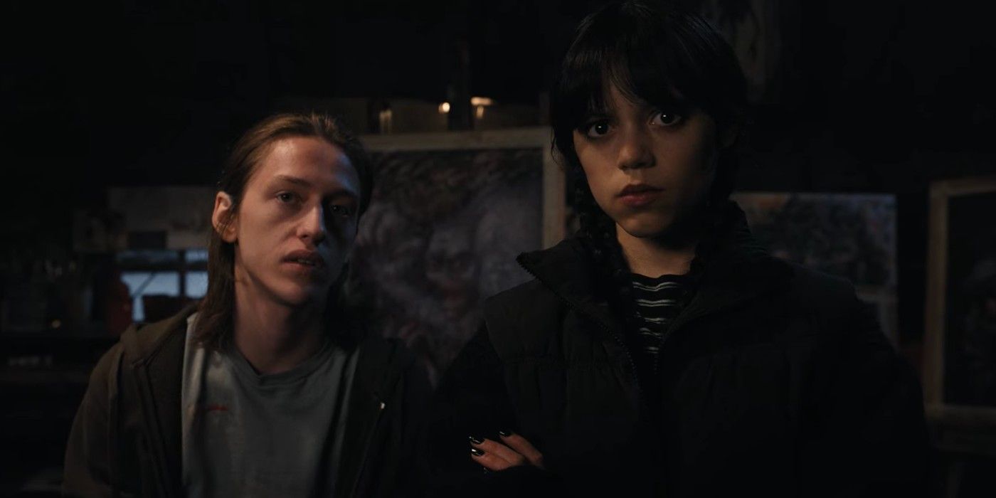 Durante Miércoles En el episodio 6, Wednesday, Enid y Tyler irrumpen en la casa abandonada de Gates con la esperanza de encontrar pruebas que ayuden a resolver el caso, y mientras buscan pistas, Wednesday le da su aspecto clásico de Addams con una sorpresa adicional. En esta escena, Wednesday viste un suéter blanco y negro típico con su amado chaleco negro hinchado y una redecilla blanca y negra tejida a ganchillo por Enid. Las niñas usan sus redecillas alrededor de la cabeza, lo que agrega un poco de diversión a su plan, además, el hecho de que Wednesday use la bufanda muestra su vínculo fortalecido con Enid.