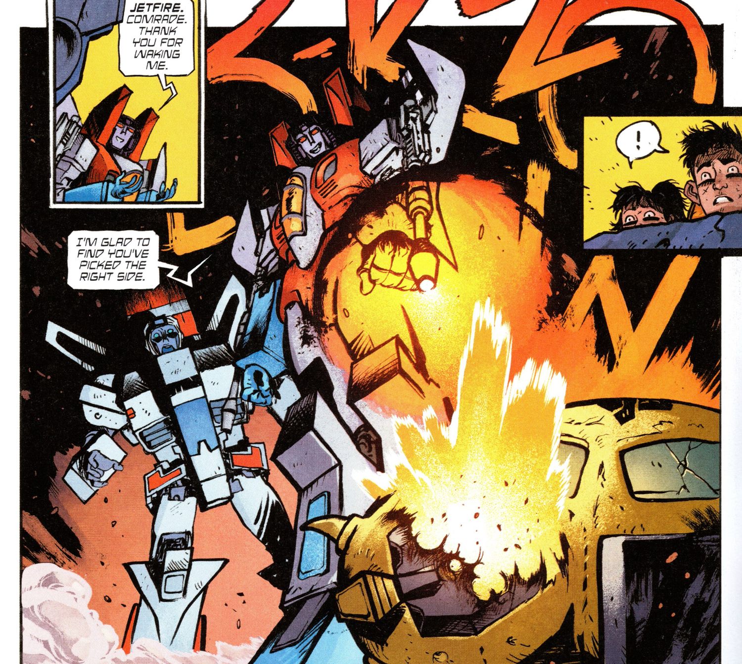 “/> Todo empezó con su aparición sorpresa al final de Rivales del Vacío #1 (Robert Kirkman, Matheus Lopes, Lorenzo De Felici), mientras Jetfire es despertado en una luna distante por los pilotos varados Darak y Solila. La historia de Jetfire continúa en Transformadores #1, donde reactiva con éxito a sus camaradas en coma que se estrellaron en la Tierra siglos antes. Sin saber que había estallado la guerra entre los Autobots y los Decepticons, Starscream revivido le dispara a quemarropa y finalmente sucumbe a su herida al final del problema. Queda por ver si Jetfire está realmente muerto o no, pero probablemente sea el Transformador más importante del Universo Energon, ya que es quien vuelve a despertar a los robots caídos en la Tierra.