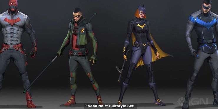 De los trajes destacados en el estilo de traje Neon Noir, se puede decir que Robin y Batgirl son los más geniales. El atuendo tradicional de Robin de Tim Drake ha sido reemplazado por una chaqueta elegante y una combinación de ropa deportiva. Batgirl sigue un tema similar, tomando más pistas del icónico rediseño New 52 de Babs Tarr mientras le da a Barbara Gordon un nuevo ajuste en el proceso.