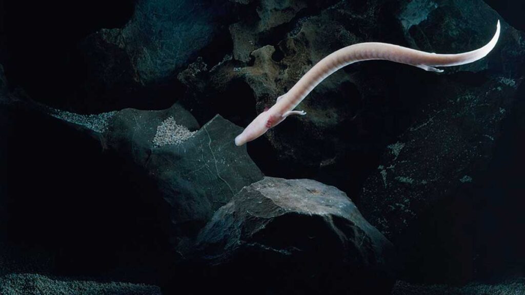Sin duda, uno de los animales más extraños del mundo. El Proteo siempre ha sido definido por los habitantes de la antigüedad como un dragón en miniatura. Una especie de anfibio que habita en las cuevas de la región balcánica y que tienen algún parentesco con las salamandras. Su rasgo más destacado radica en que pueden estar más de una década sin probar bocado mientras mantienen una salud de hierro.