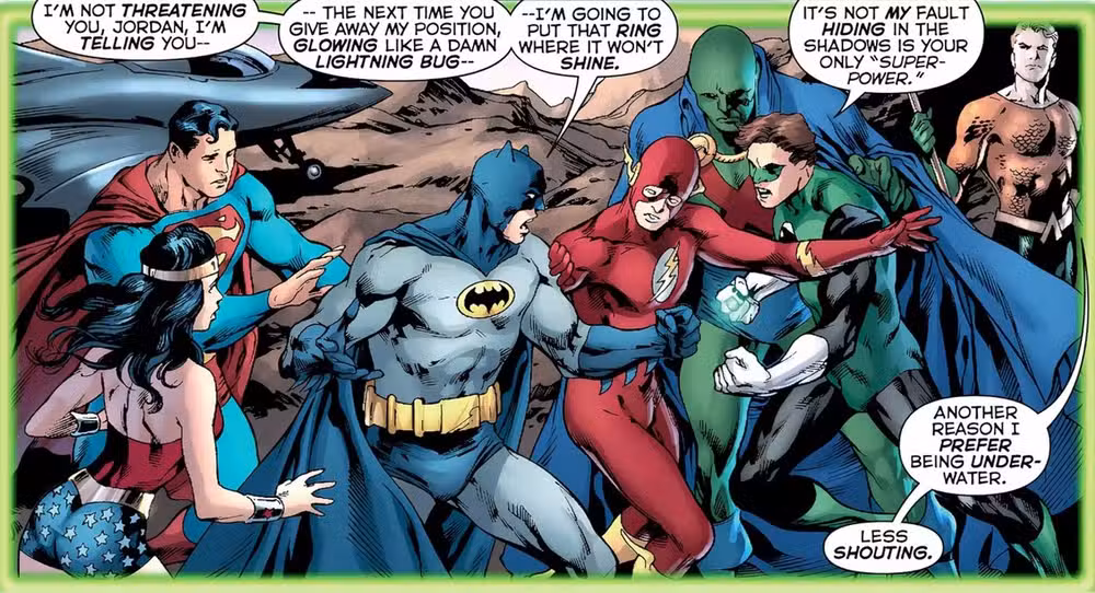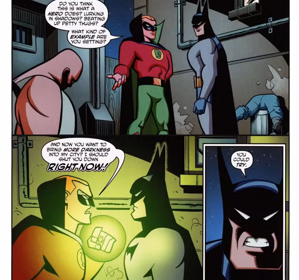 Mientras que Scott se dedica a iluminar la oscuridad y difundir esperanza, Batman es una criatura de la noche. En este punto de la historia del cómic, Green Lantern conoce a Batman el tiempo suficiente para saber que es efectivo, pero nunca ha podido hacer las paces por completo con sus métodos.