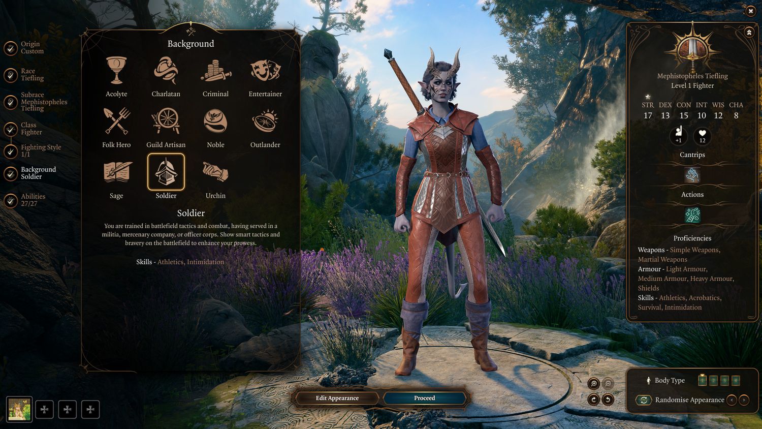 “/> El fondo del soldado combina el atletismo con la intimidación. Como tal, es la opción ideal para clases centradas en el combate que aún desean tener la capacidad de sobresalir en las opciones de diálogo basadas en el carisma. Los personajes con Trasfondo de Soldado obtienen puntos extra cuando amenazan a los NPC y se benefician del Atletismo si estallan peleas. El trasfondo de soldado es más flexible que otros, ya que tanto las clases basadas en carisma como en fuerza pueden beneficiarse. Las clases basadas en el carisma, como el Hechicero y el Brujo, pueden beneficiarse de Competencia en atletismo, una habilidad que normalmente no tendrían. De manera similar, las clases basadas en la Fuerza, como el Luchador y el Bárbaro, obtienen Intimidación, lo que se adapta bien a la estructura general de su clase.