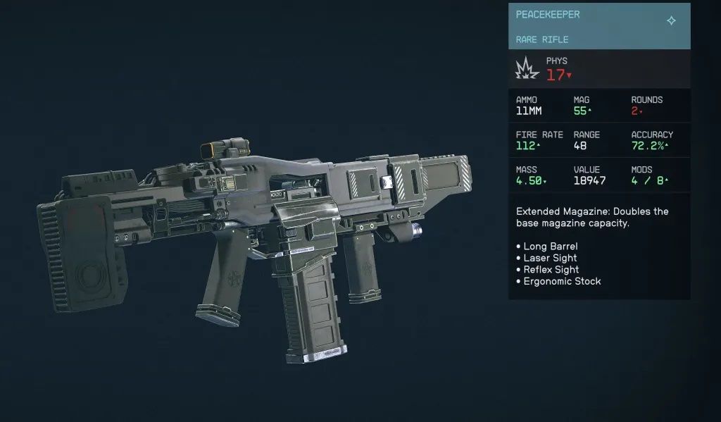 Como AA-99, el Peacekeeper tiene un daño razonable de 20 y un alcance de 40. El arma es precisa y tiene un cargador de buen tamaño. El arma es genial desde el principio del juego, aunque pierde su brillo al final de la historia principal. Sin embargo, el Peacekeeper tiene ocho espacios de modificación y es muy fácil de personalizar para convertirlo en algo aún más fuerte.
