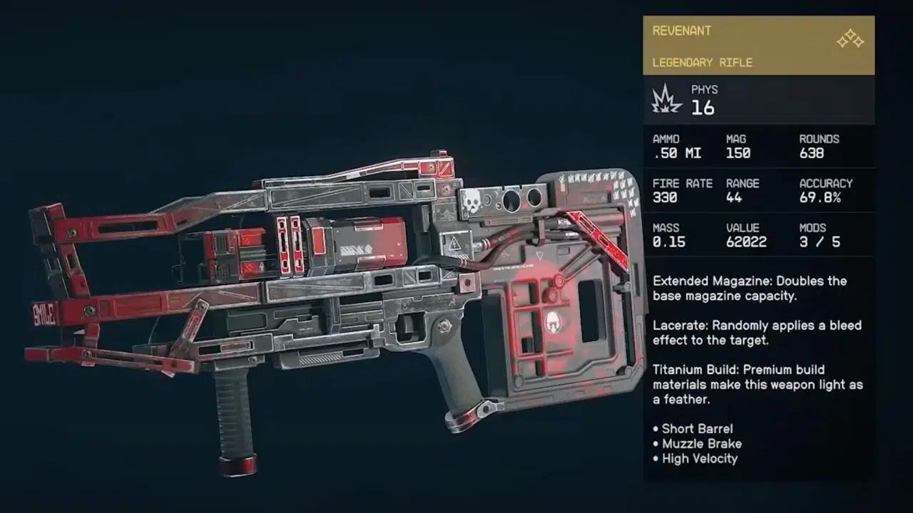 Revenant dispara ultrarrápido con una velocidad de disparo de 330. También tiene un tamaño de clip grande de 150, lo que te permite disparar durante mucho tiempo antes de recargar. La pistola comienza con el mod lacerate, que puede causar daño por sangrado, y es muy liviana gracias a su construcción de titanio. El único inconveniente del Revenant es su escasa precisión, lo que puede provocar que muchos de esos tiros fallen.