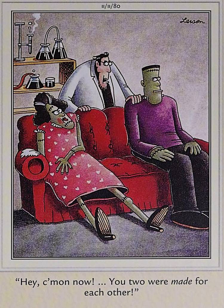 El tercer Frankenstein de Gary Larson Lado lejano de 1980 es otro gran ejemplo de su capacidad para tomar el chiste evidente y justificar su realización. Si bien el Dr. Frankenstein de Larson es a menudo un poco idiota, esta tira lo presenta como el mediador en un conflicto entre el monstruo y su novia. “Oye, vamos ahora“, dice, cerniéndose sobre ellos mientras se aferran a lados opuestos de un sofá, “¡Ustedes dos fueron hechos el uno para el otro!” Aquí, Larson toma una frase común, a menudo empleada para calmar a los amantes de las peleas, y descubre la pareja romántica a la que podría ser más literalmente aplicable.