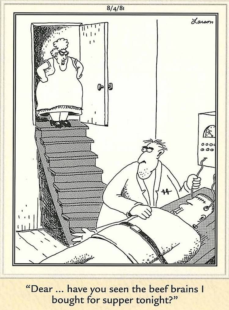 también. - El genio cómico de Larson surgió de encontrar la manera perfecta de hacer chistes obvios, como se ve repetidamente en lo descaradamente absurdo de las interacciones del Dr. Frankenstein con su monstruo e Igor.