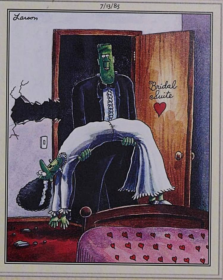 Las historias de noches de bodas de muchas personas incluyen algún tipo de contratiempo o accidente menor, lo que contribuye a que la experiencia sea aún más memorable y, de alguna manera, aún más perfecta. El monstruo de Frankenstein y su novia no son una excepción, como este Lado lejano El panel muestra el momento en que el monstruo lleva a su nueva esposa a través del umbral de la suite nupcial, estrellando su cabeza contra la pared en el proceso. Si bien ella ciertamente parece atónita, cuando Gary Larson la dibuja, en última instancia, es probable que sea solo una pequeña peculiaridad de su noche especial.