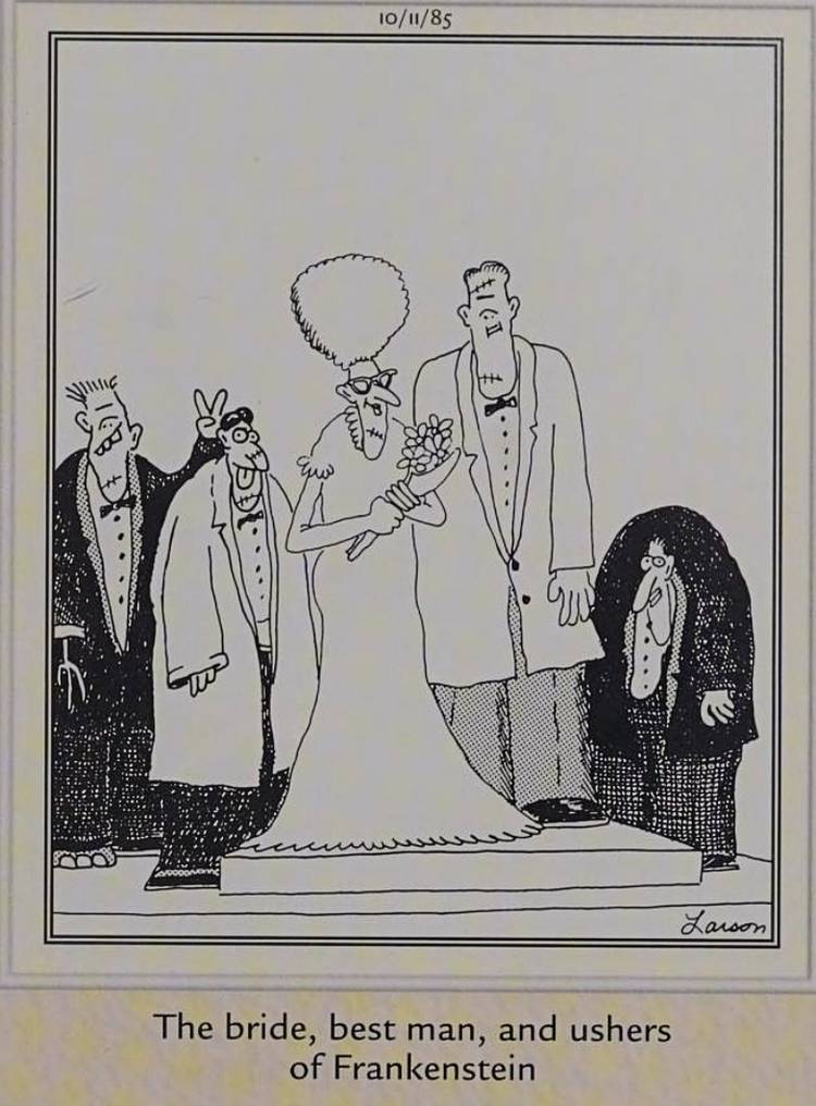 Una vez más, Gary Larson ofrece un chiste de Frankenstein simple pero muy efectivo. Gracias a la película de 1935. La novia de frankenstein, secuela de la película de monstruos original de Boris Karloff de Universal, la idea de una mujer creada como compañera del monstruo es tan perdurable en la cultura popular como el monstruo mismo. Aquí, Larson razona que si hay novia, también hay fiesta de boda – incluso si se trata de un evento escasamente concurrido. Igor y lo que parece ser otro monstruo están al menos vestidos apropiadamente, con trajes negros, aunque el Dr. Frankenstein ha insistido obstinadamente en usar su bata de laboratorio para las nupcias.