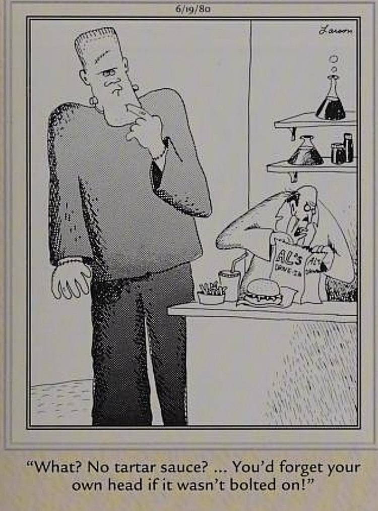 El creador Gary Larson reimaginó con humor a Frankenstein en varias entregas de la tira a lo largo de los años, retratando a menudo al Dr. Frankenstein como un idiota que hacía la vida más difícil a todos los que lo rodeaban. - El monstruo de Larson se basó visualmente en el clásico Universal de 1931.