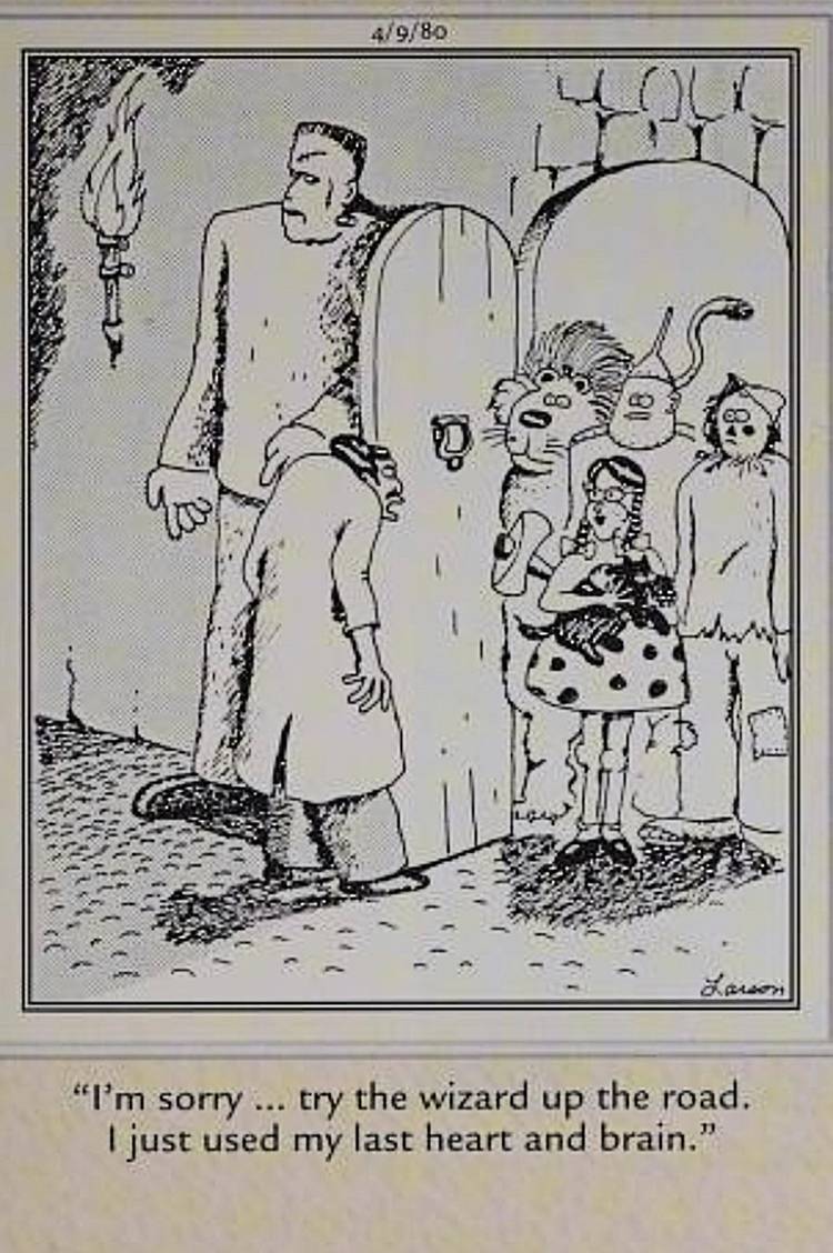Graciosamente, vale la pena preguntarse si el monstruo parece tan preocupado aquí porque teme que el León, el Hombre de Hojalata y el Espantapájaros le quiten sus órganos recién trasplantados, robándole así su nueva existencia. Este panel es uno de los primeros indicadores de cuán agudo era el sentido de la parodia de Larson; reconoció que ambas películas famosas, frankenstein y Onzdependía de la adquisición de órganos –aunque en contextos muy diferentes, por razones muy diferentes, con resultados totalmente diferentes– y esta broma surgió naturalmente de ahí.