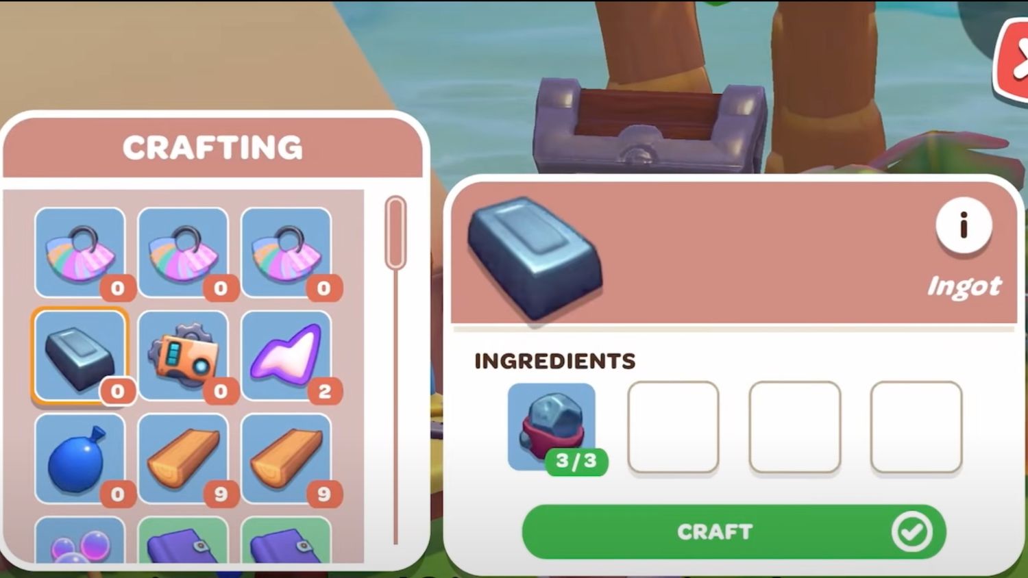 Desafortunadamente, ambos elementos también deben diseñarse. El lingote requerirá mineral de hierro y la madera necesitará cocos. Una vez completado, el pico estará disponible. herramienta que puede destruir rocas y recuperar elementos que de otro modo serían inalcanzables.