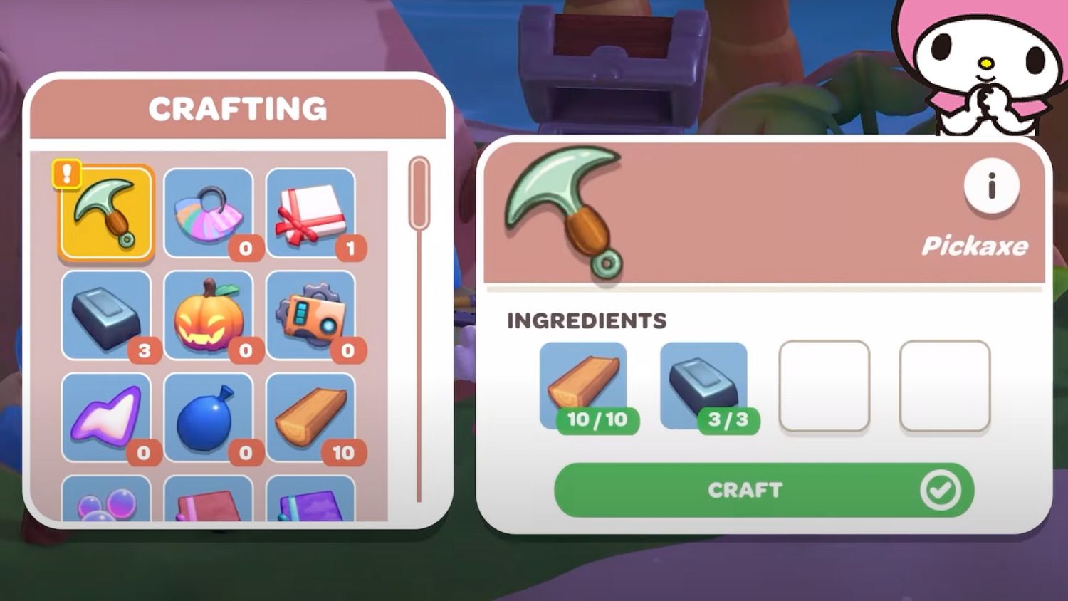 “/> Una herramienta que los jugadores probablemente aprenderán un poco más tarde es el pico. Después de alcanzar nivel de amistad 11 con My Melodyel ‘Limpiando el Oasis’ La misión estará disponible. Durante esta misión, los planos de elaboración del pico estarán disponibles y, para poder elaborarlo, los jugadores deberán adquirir 10x Lingote y 10x Madera.