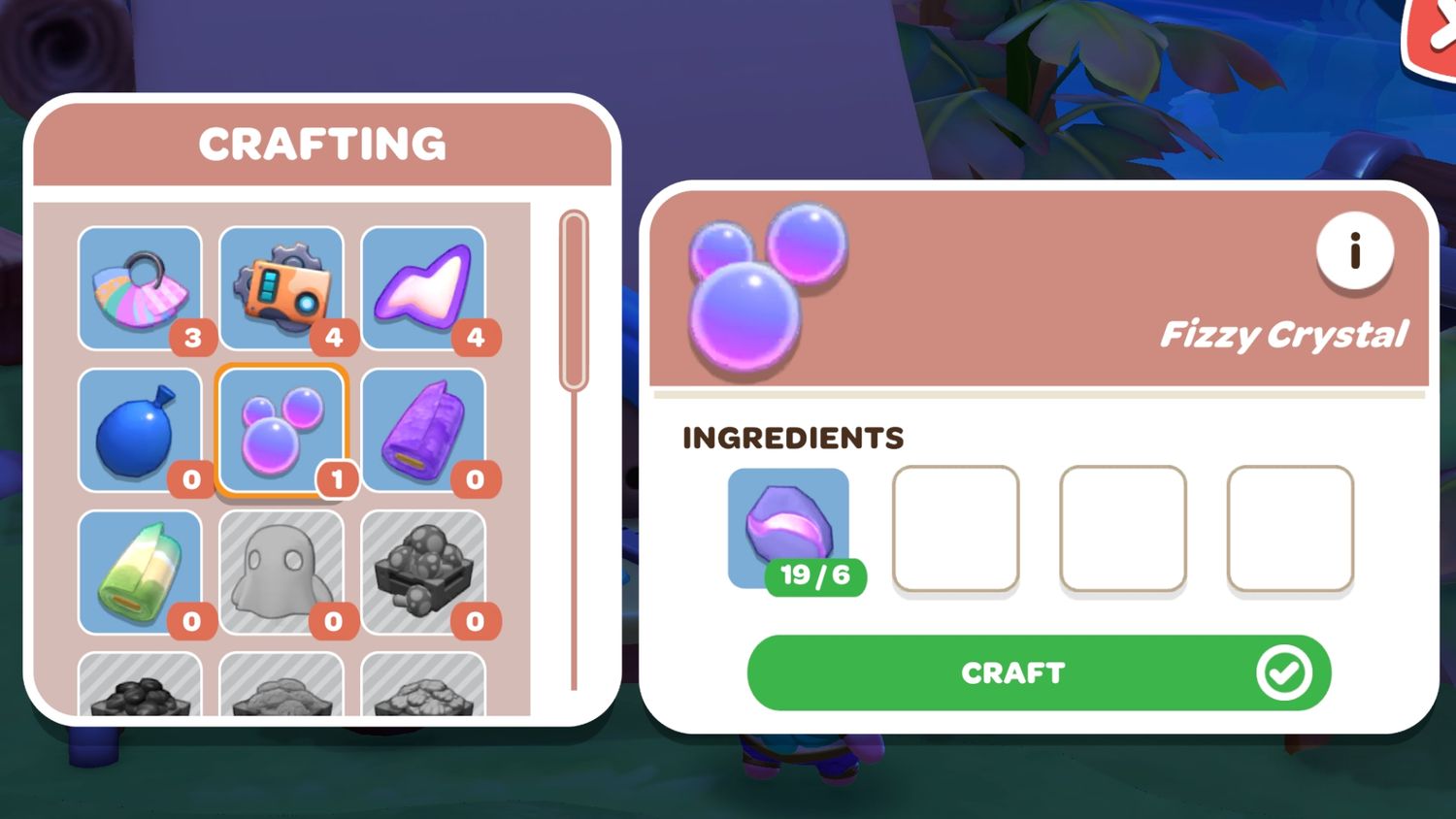Mientras reparan la máquina de postres, se les pedirá a los jugadores que configuren la segunda mesa de elaboración de Chococat, donde deberán fabricar Fizzy Crystals. Esto se hace con 6 mineral gaseoso, que se puede encontrar en la cueva del carro minero en Gemstone. Para desbloquear este plan de elaboración, los jugadores deben subir de nivel su amistad con ambos Pompompurin hasta el Barco de postre La misión está disponible.