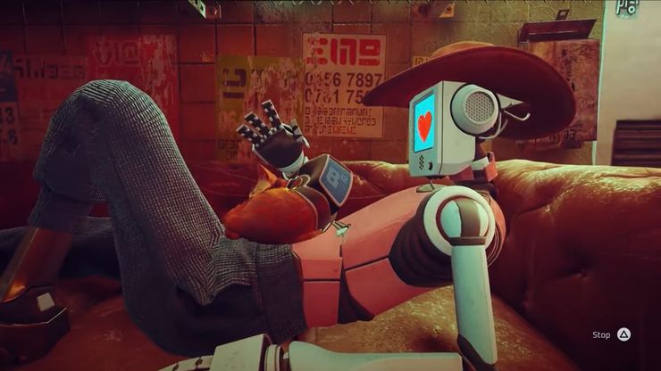 Mientras exploran Midtown, los jugadores se cruzarán con un robot que duerme una siesta en un sofá. Saltar sobre el vientre del bot despertará al personaje, donde el bot mirará hacia el espectador con un signo de interrogación en su monitor facial. La cabeza del robot girará para mirar al gato, que ahora se acurruca para dormir boca abajo, y el monitor cambiará a un símbolo de corazón. A pesar de que Extraviado muestra que los jugadores quieren ser bichos molestos, esta interacción revela que tal vez los jugadores también quieren ser bichos lindos.