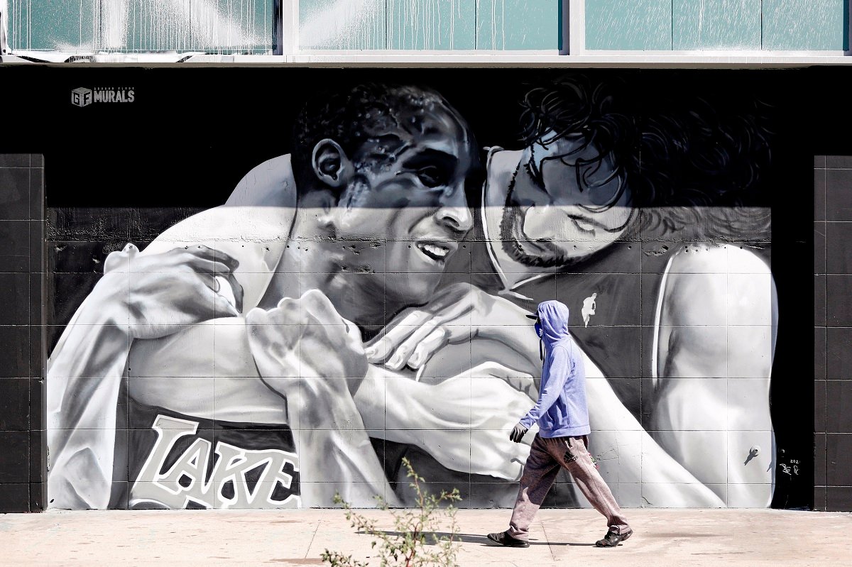 La historia de cómo llegaron a pintar este mural sobre Gasol y Bryant, que juntos ganaron dos anillos de campeones de la NBA con los Lakers, tiene mucho que ver con la pandemia.