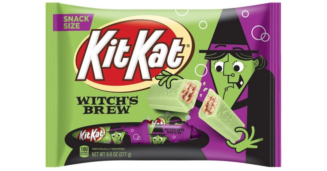 Primero está Kit Kat Witch’s Brew y no dejes que el color verde brillante del caramelo te engañe. No es solo un cambio cosmético, ya que el revestimiento de color espeluznante es un sabor a crema de malvavisco que se dice que tiene un perfil de sabor similar al chocolate blanco. El dulce también combina su empaque con esa crema verde, ya que el sabor especial de las fiestas viene en un paquete morado y verde completo con una bruja espeluznante revisando el dulce por sí misma.