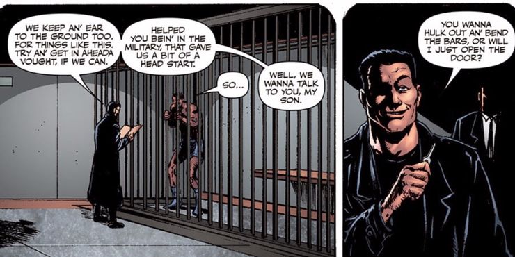 Cuando MM acepta la oferta de Butcher de unirse a los Boys, Butcher le hace un comentario que solo alguien familiarizado con Marvel Comics podría haber hecho. Carnicero le dice a MM, “¿Quieres que Hulk salga y doble los barrotes, o simplemente abro la puerta?Butcher hace una clara referencia a Hulk a pesar de que no existe tal supe con ese nombre en Los chicos universo. Por lo que se ha explicado a lo largo de la serie, los únicos cómics u otras formas de medios de comunicación de superhéroes que existen son los producidos por Vought-American que presentan exclusivamente superhéroes que realmente viven en su mundo. Con el comentario de “Hulk” de Butcher, ese hecho se cuestiona e implica la existencia de Marvel Comics, así como potencialmente de otros editores de cómics del mundo real dentro de Los chicos universo.