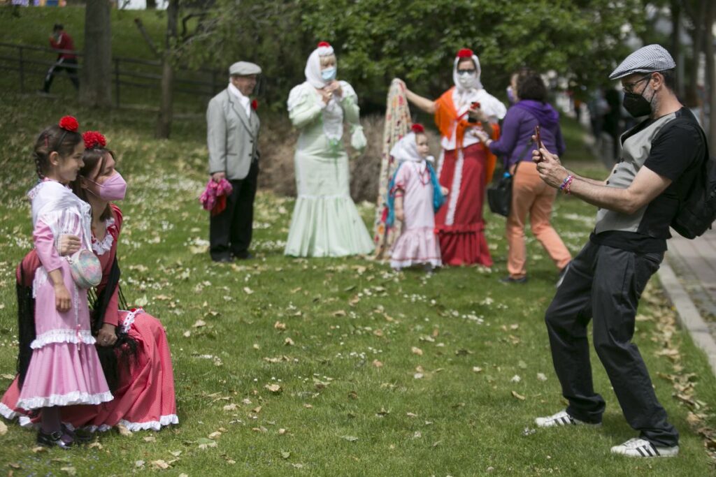 Una pareja de chulapos de unos 70 años pasea por los alrededores de la ermita de San Isidro. En sus mascarillas, una foto estampada de ellos mismos ataviados de la misma forma. La mandaron confeccionar hace unas semanas para ponérsela el día del patrón de Madrid. “Qué ganas teníamos, de volver a vivir la primera verbena del año, aunque bueno… esto está muerto”, se lamenta Araceli. Verbena hay poca. Solo algunas decenas de madrileños, de nacimiento o de adopción, pasean por una pradera que en un año normal debería estar llena de música, chotis, puestos de comida y grupos de amigos en el césped.