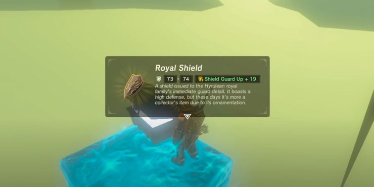 Después de regresar al Travel Medallion, Link tendrá que bajar del saliente oculto y agarrarse a sí mismo con un pilar Cryonis. En este punto, el cofre ya estará cayendo de la superficie, por lo que los jugadores tendrán que congelarlo con la runa Stasis para que no desaparezca antes de que puedan agarrarlo. A partir de aquí, los jugadores deberán alinear cuidadosamente el cofre con una bomba remota antes de dispararle unas 40 flechas y detonar la bomba en Bullet Time para golpear el cofre hacia Link. Si todo se ha hecho correctamente, los jugadores podrán engancharlo con la runa Magnesis y recuperar el Escudo de caballero o el Escudo real en el interior, según la escala del arma.