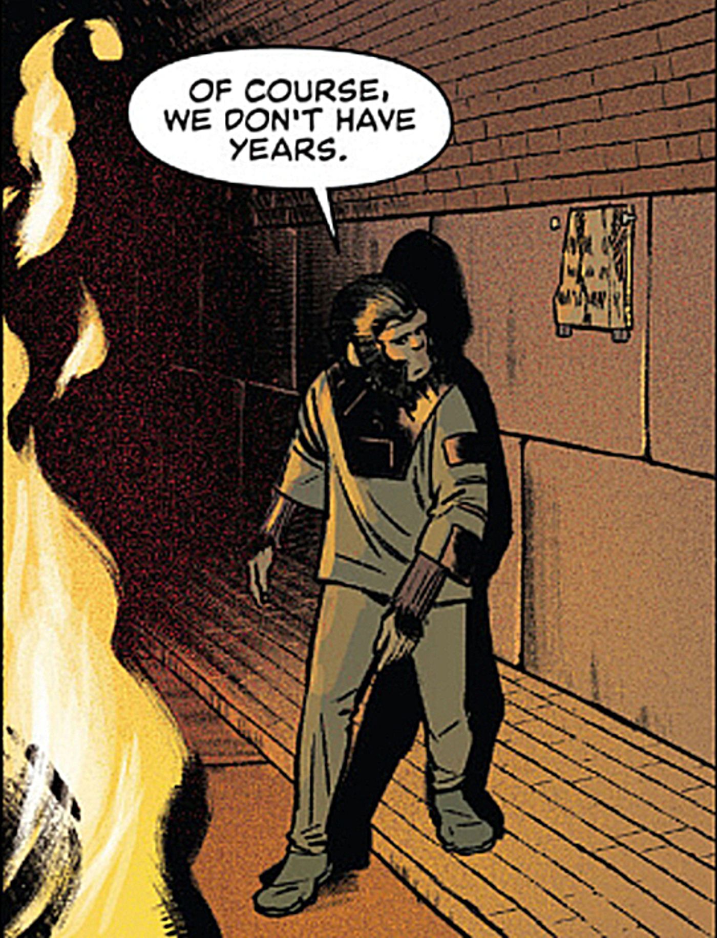 Es famoso que la Tierra del futuro aparentemente fue destruida por la activación de una bomba nuclear por parte de Taylor al final de la secuela de 1970 de la película original. Debajo del planeta de los simios, liderando secuelas posteriores para ir al pasado y desentrañar los orígenes de la dominación de los simios en la Tierra. Como resultado, la franquicia ha estado estancada en un estado narrativo detenido durante más de cincuenta años. Iteraciones anteriores de cómics de simios han regresado a la continuidad y el escenario de la película original, pero casi exclusivamente como precuelas.